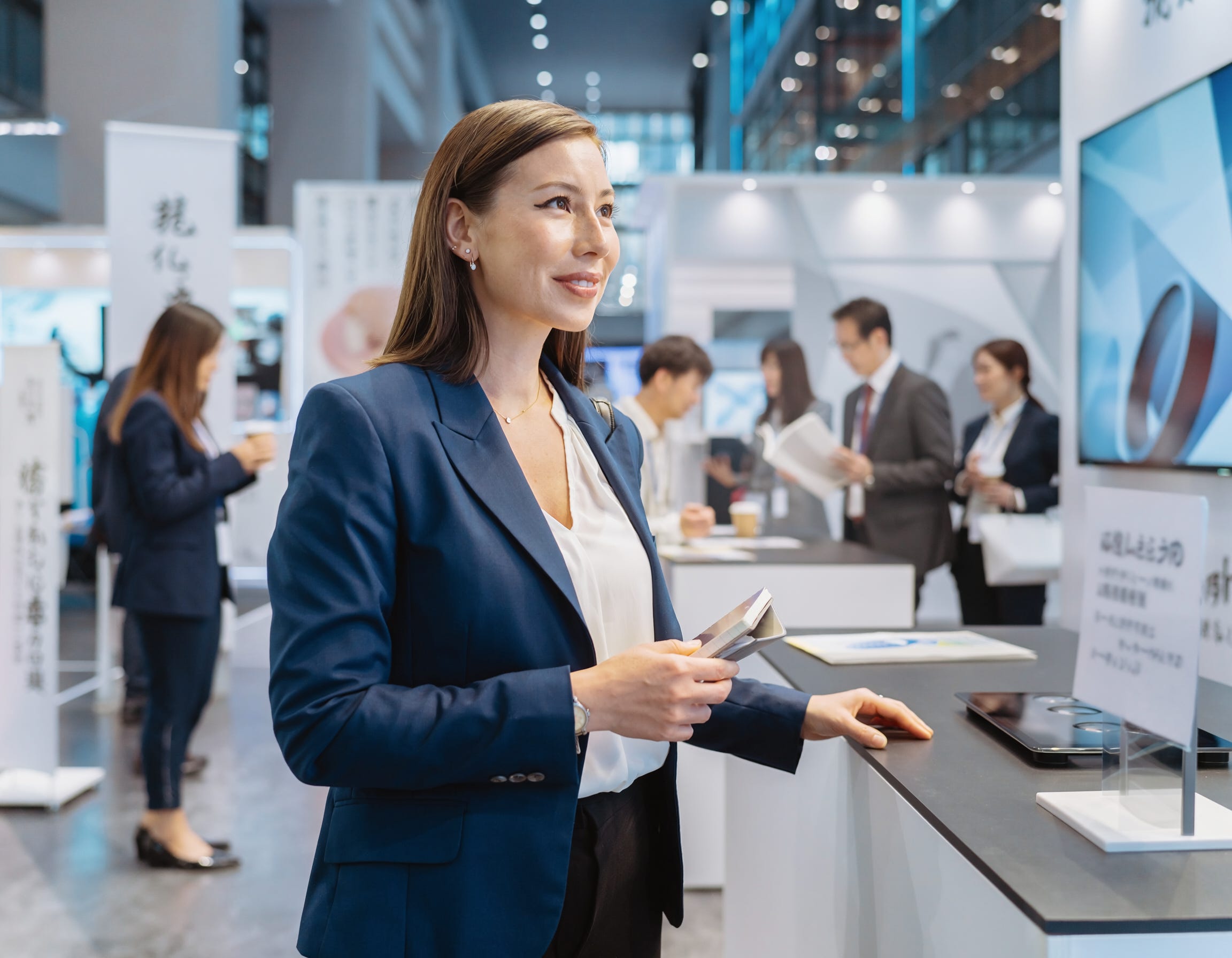 Description by Claude: A professionally dressed woman in a navy blazer and white blouse stands at an exhibition booth, holding a small booklet or brochure while resting her hand on a display counter. She smiles confidently as she looks off to the side, suggesting she may be a presenter or attendee at a business trade show or tech expo. Japanese text on banners and signage throughout the venue hints at a Japan-based or Japanese-focused event. In the background, several other business professionals in formal attire are engaged in conversation, browsing materials, and networking among sleek white booths. Large display screens and spotlit product displays add to the polished, corporate atmosphere of the space.